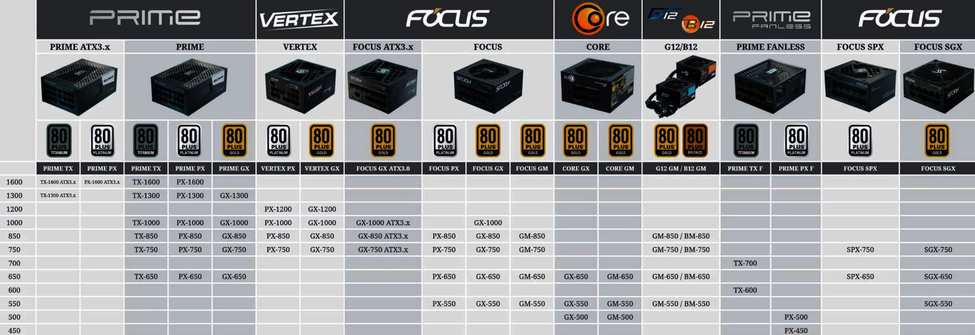 مستوى متوسط/متوسط: ١٠٠٠ واط (CORE، FOCUS، سلسلة VERTEX)، ٨٥٠ واط، ٧٥٠ واط.